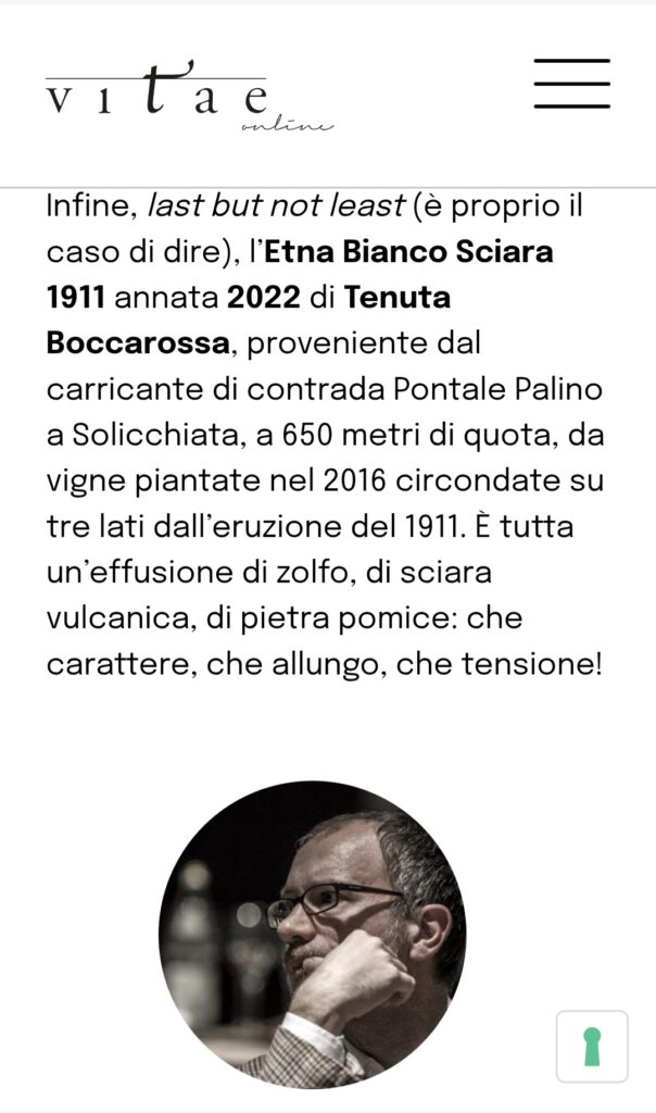 ETNA ROSSO 2018: “Rubino brillante. Al naso ampio bouquet di viole, iris e rosa canina, humus, spezie dolci, note minerali di pietra focaia e più scure di china e grafite, cuoio. Palato vigoroso, in perfetto equilibrio fresco-sapido, con tannini vellutati ben stemperati nel corpo del vino e vibrante nerbo alcolico che non ostacola il ritorno gustolfattivo coerente.”